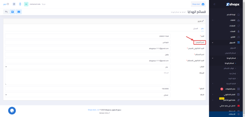 خطوات التعديل علي اسم المرسل الخاص بقسائم الهدايا :