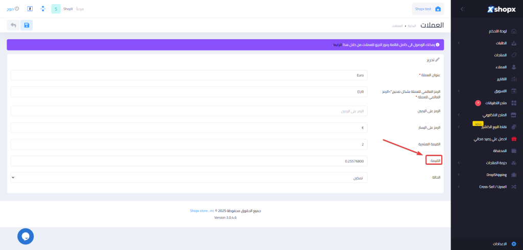 خطوات التعديل علي القيمة الخاصة بالعملة :