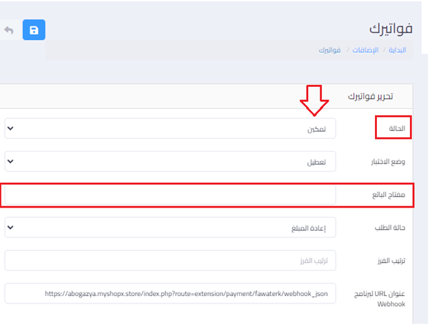 - قم بتعديل الحاله الي تمكين و وضع مفتاح البائع لتفعيل الاضافه علي متجرك